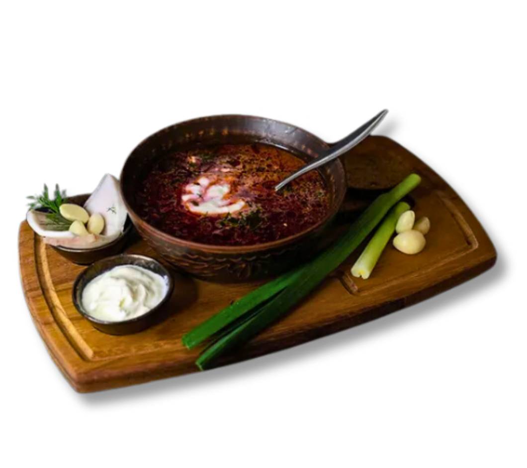Borsch is a traditional Ukrainian beetroot soup, known for its vibrant color and rich flavor. It’s made with fresh vegetables like cabbage, carrots, potatoes, and beets, often complemented by tender pieces of meat. Served hot with a dollop of sour cream, Borsch is a perfect balance of earthy and tangy flavors. This hearty dish is a staple of Ukrainian cuisine and can also be made as a vegetarian option.